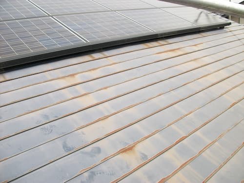 屋根には太陽光発電システムパネルが設置されているお宅なのですが、弊社ではこちらの太陽光発電システムパネルも一旦起こしながらパネル下も塗装をしていきます(^^)v