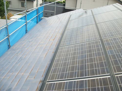 有限会社大久保建装ではこのような太陽光発電システムパネルが設置された屋根塗装・外壁塗装工事も大得意分野です(^^)v