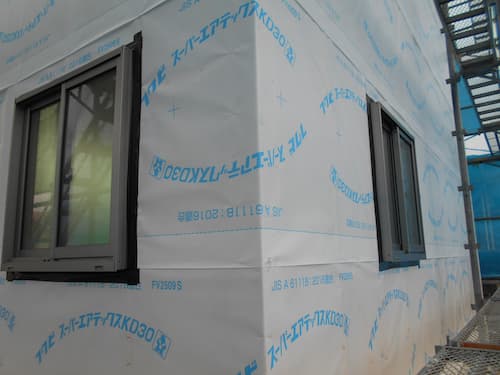 もう少し丁寧に工事状況をお伝えするつもりでおりましたが、躯体工事も終わり、サッシ工事も終わり、透湿防水シートも丁寧に張り終えて、現在はもう外壁工事も終わろうとしている段階です(^^)v